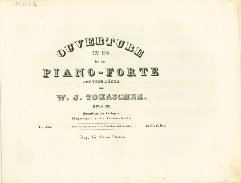 See in HOFMEISTER: HofmeisterMLM März, April 1832, p. 23Musik für das Pianoforte. 14. Ouverturen für das Pianoforte zu vier Händen. Tomaschek, W. J., Ouverture Op. 38 in Es _48[kr.], Composer: Tomášek, Václav Jan (1774-1850) Material: part: pf (13p.) ; 26,5 x 33 cm Watermark: J C: S. (no. 1) RISM A/I: 1001113245 Copy examined for cataloging: CZ-Pu 59 A 5813 Other exemplars: CZ-Pu 59 A 10832 -- CZ-Pnm XLV C 61 National Bibl. number: cnb001920549 [ https://aleph.nkp.cz/web/berra/_523.htm ]