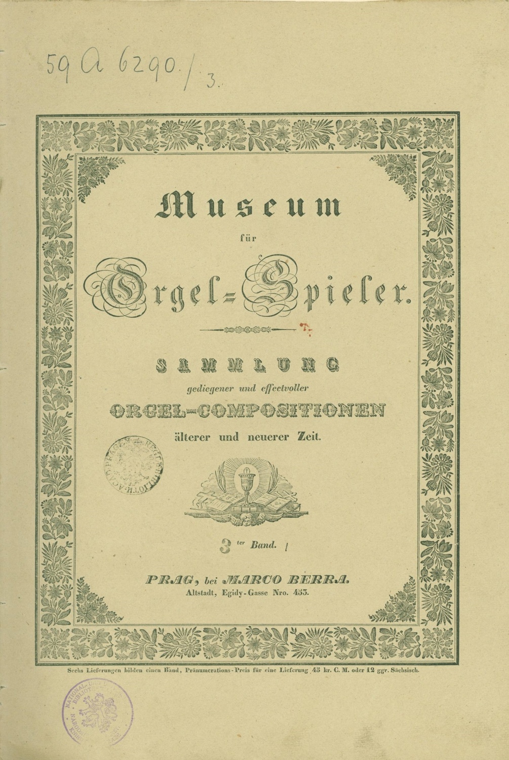 Genre: Preludes and FuguesImprint: PRAG bei MARCO BERRA | Altstadt, Egidy-Gasse Nro 453 [on cover]; M: B: 552a[-f] Year: [1833-1834]Price: 6f See in M.B. Catalogue: Musik für die Orgel. Museum für Orgelspieler, Sammlung gediegener und effectvoller