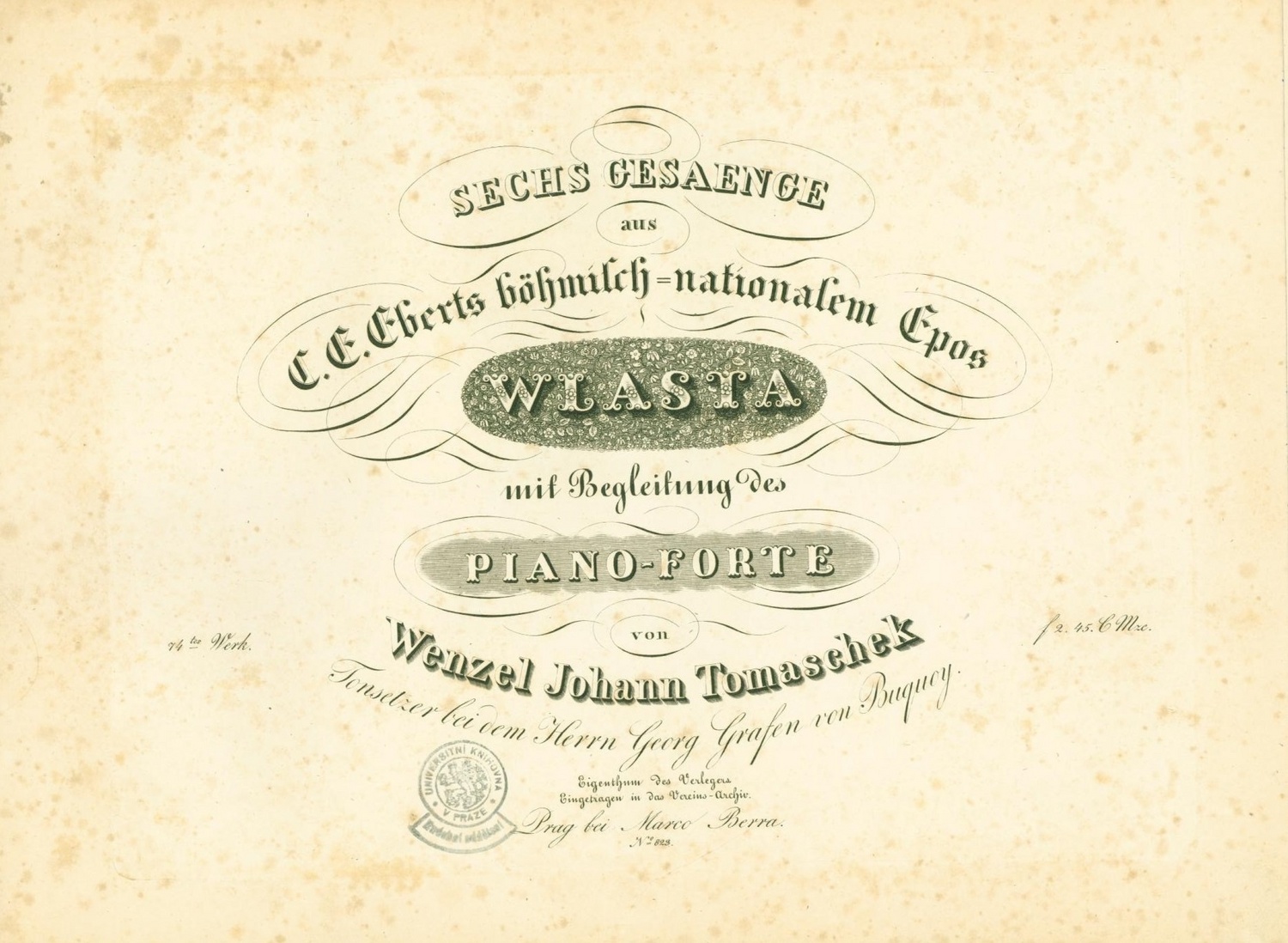 Composer: Tomášek, Václav Jan (1774-1850) Text: Ebert, Karl Egon (1801-1882) Dedicatee: Fürstenberg, Amalie Christine Caroline Material: score: 41p. ; 24 x 32,5 cm Watermark: [without watermark] RISM A/I: 1001113840 Copy examined for cataloging: CZ-Pu 59 A 2028 (without plate no. inside) Other exemplars: CZ-Pu 59 B 4018 (dig. doc.) -- CZ-Pnm XLV C 129 National Bibl. number: cnb001920532 Remarks: Cover with title in printed frame: "W. J. TOMASCHEK | WLASTA. | 74. Werk | [at left:]